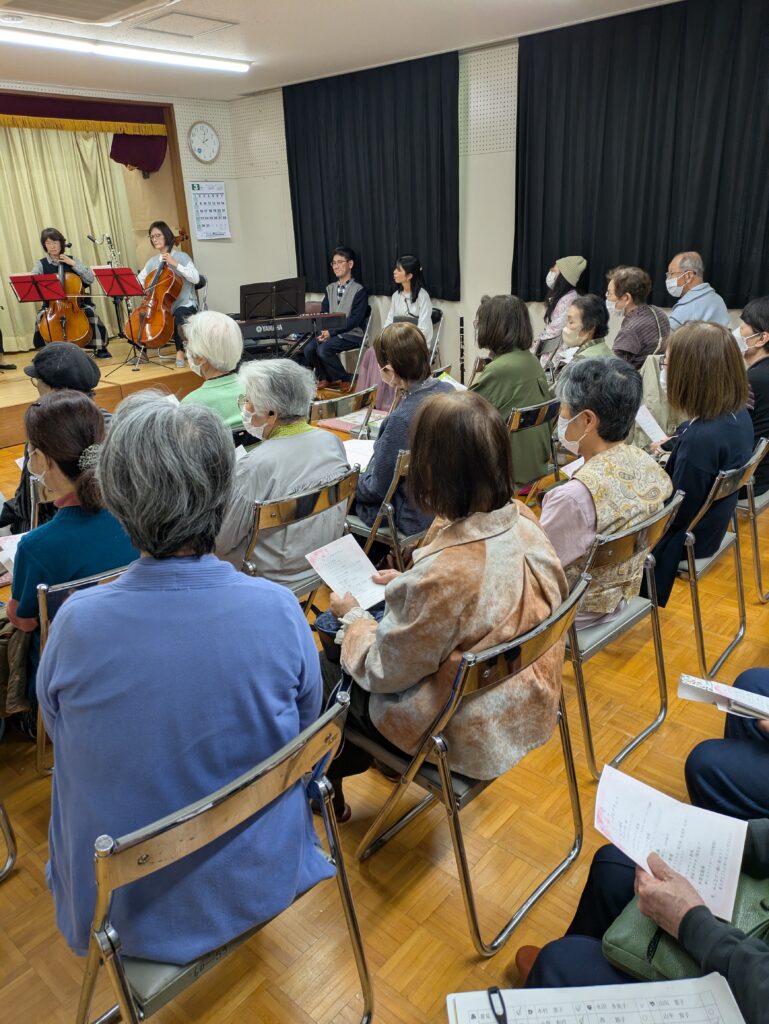 これは南八幡町自治会老人部依頼によるコンサートで、天気にも恵まれ、当自治会主催による「桜を愛でる会」行事の一環として、大学内の桜を鑑賞した後、音楽を楽しむという主旨の行事でした。30名を超す自治会の方々を前に、チェロ、木管楽器、トランペット、ピアノなどさまざまな楽器のアンサンブルを演奏しました。